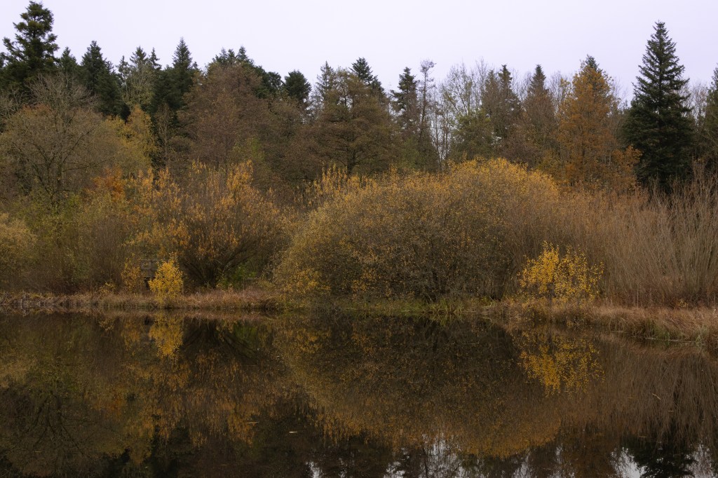 Since my last blog, on November 4, 2023 the temperature has further cooled, days shortend to just about 9 hours and the snowline fallen to 1200 – 1500 m (3600 – 4500 feet). Only a few weeks ago, my time with the camera in the woods depended on my other schedules. We had such a beautiful fall. Anytime was right to pack up the camera and to be outside. Now, my outings are dictated by periods of little or no rain. Everything else has to accomodate – more or less. A warm coat and hat accompany my strolls in the woods.